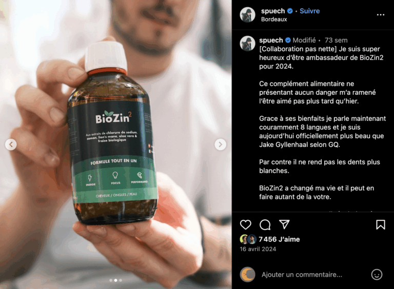 La deuxième dérive concerne la promotion de produits douteux. Nombre d’influenceurs sportifs collaborent avec des marques de compléments alimentaires, de brûleurs de graisses ou de substituts de repas. Or ces produits ne sont pas toujours adaptés ni scientifiquement validés. Le vidéaste Simon Puech l’a démontré avec une expérience marquante : il a créé un faux complément alimentaire, le BioZin2, contenant en réalité le nom d’une molécule toxique, le soman, et plusieurs influenceurs ont accepté d’en faire la promotion sans vérifier au préalable la composition.